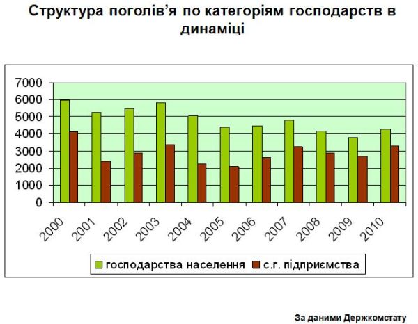 У порівнянні з попереднім роком поголів’я свиней зросло на 3,8%, при чому у сільськогосподарських підприємствах — на 7,2%, у присадибних господарствах — на 1%. Відтак зберігається тенденція до стійкого нарощування пррмислового виробництва свинини в Україні, що намітилася у 2005 році: так, співвідношення поголів’я свиней у присадибних господарствах та сільськогосподарських підприємствах у 1990-му становила 28% до 72%, але вже у 2009-му — 58% до 42%, а у 2010-му — 56% до 44%.