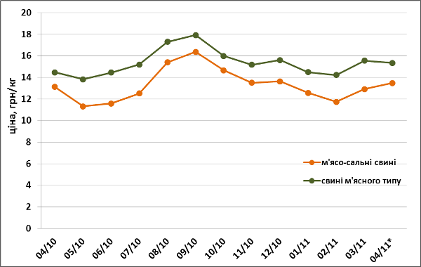 Станом на 14 квітня ціна на м'ясо-сальних свиней сягнула в середньому 13,49 грн/кг, що на 0,36 грн/кг (2,7%) дорожче, ніж два тижні тому. Ціна на свиней м’ясного типу становила 15,35 грн/кг, що на 0,45грн/кг (2,9%) дешевше, ніж 29 березня.
