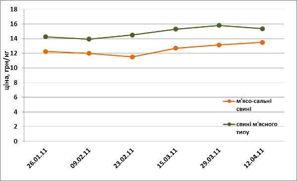 В першій половині квітня поточного року ціни на свинину рухаються в різних напрямках. М’ясо-сальні свині продовжують дорожчати, тим часом ціна на свиней м’ясного типу дещо знизилась. У порівнянні із аналогічним періодом попереднього року, у квітні 2011-го м'ясо-сальні свині коштують на 0,37 грн/кг (2,8%) дорожче, а ціна на м’ясних свиней зросла на 0,87 грн/кг (6%).