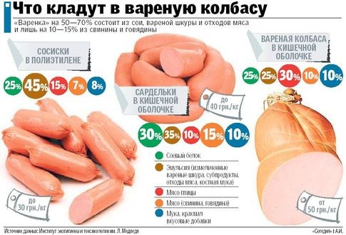 В Украине вступил в силу закон, по которому все колбасы должны быть изготовлены по единому госстандарту (ДСТУ), а не по техусловиям (ТУ) каждого производителя, как сейчас. Сделано это, чтобы повысить качество колбас, прежде всего вареных, в которые кладут в основном сою и отходы мяса (см. инфографику).