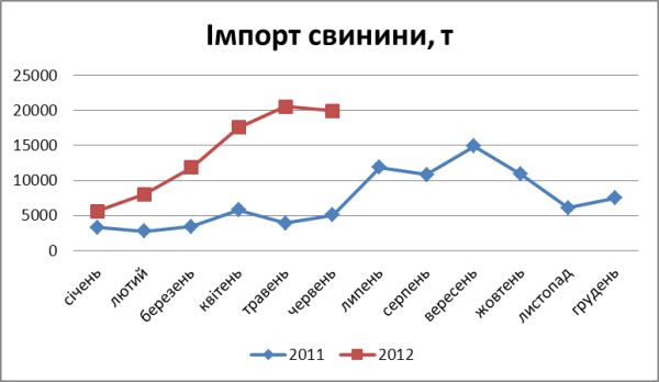 Імпорт свинини у червні 2012 року склав 19 974 т, що в 3,9 разів більше, ніж в аналогічному періоді попереднього року. Про це свідчать дані останнього звіту про стан свинарства від аналітичного відділу компанії «Дикун». Відносно травня імпорт свинини зменшився на 2,9%.