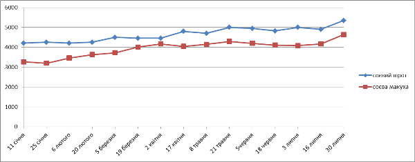 Середньовиважена ціна на соєвий шрот склала 5 350 грн/т, що на 9,2% більше за ціну станом на 16 липня. Ціни на соєву макуху станом на 30 липня знаходяться в межах від 5 300 до 5 400 грн/т.