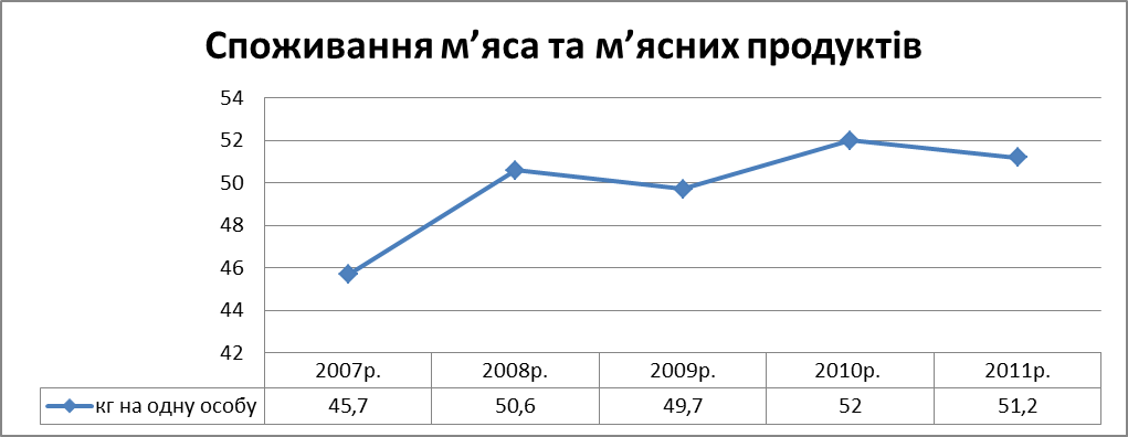 У 2011 році споживання м’ясних продуктів зменшилось на 1,5% до 51,2 кг на особу