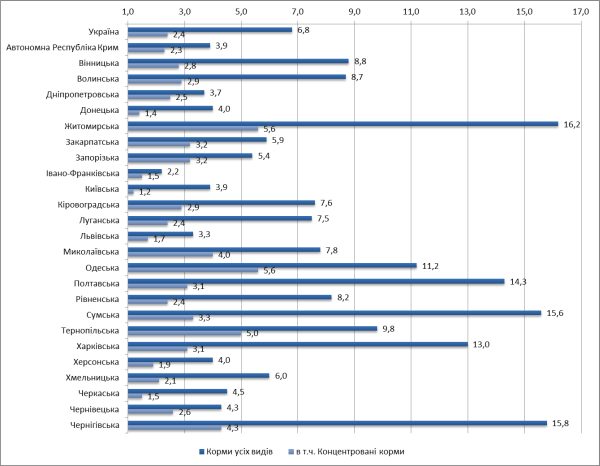 Серед областей лідерами по наявності кормів усіх видів в розрахунку на одну умовну голову є Житомирська область — 16,2 ц кормових одиниць, а концентрованих кормів — Одеська область (5,6 ц кормових одиниць).