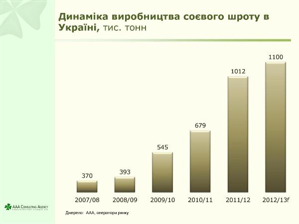 Виробництво соєвого шроту в Україні в 2012/2013-му маркетинговому році зросте на 8,7% у порівнянні з попереднім роком — до 1100 тис. тонн. Такий прогноз озвучила керівник аналітичного департаменту Консалтингової Агенції ААА Марія Колесник під час IV міжнародного конгресу «Зерновий Олімп», що відбувся 4-го грудня в Києві.