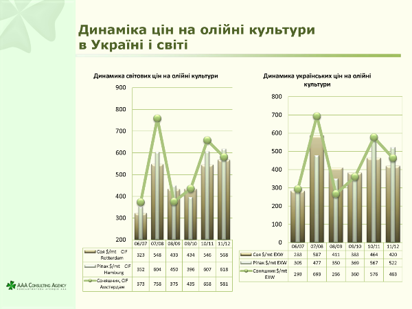 В 2011/12-му маркетинговому році в Україні спостерігалося зниження цін на основні олійні культури в порівнянні з попереднім сезоном. Про це розповіла керівник аналітичного департаменту Консалтингової Агенції ААА Марія Колесник під час IV міжнародного конгресу «Зерновий Олімп», що відбувся 4-го грудня в Києві.