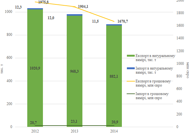 Такі негативні явища призвели до зменшення зовнішньоторгового обороту на 233,41 млн євро лише за перші чотири місяці поточного року. Деяке скорочення середніх експортних цін не стимулювало розширення експорту. Варто зазначити, що імпорт стримується не тільки високим рівнем внутрішньої пропозиції, але й «відголоском» стрімкого злету середньої його ціни у відповідному періоді 2013 року.