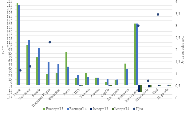 Структура торгівельного балансу ЄС по свинині в розрізі країн за січень-квітень 2014 року (тис. т) та ціни в розрахунку на 1 тону