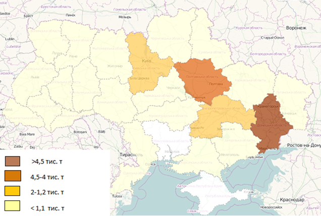 Найсуттєвіше обсяги збільшились в Харківській, Сумській та Дніпропетровській областях — на 190,7%, 141% та 132% відповідно у зіставленні із січнем-червнем минулого року. «Відставати» від минулорічних показників почали Вінницька, Донецька, Житомирська, Закарпатська, Івано-Франківська, Кіровоградська, Херсонська, Черкаська та Чернівецька області.