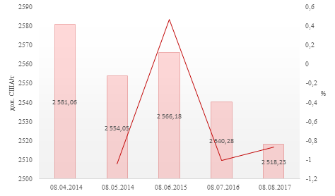 Найвищій рівень цін минулого тижня встановився 4.08.2014 р. і дорівнював 2 581,06 дол. США/кг. Торги у вівторок 05.08 відзначилися скороченням ціни на 1%, після чого трохи зросли у середу та продовжили спадаючу тенденцію у кінці тижня. Мінімальна ціна на поставки свиней спостерігалася під час п’ятничних торгів, коли вона впала до 2 518,23 дол. США/т, що більш ніж на 2% нижче за рівень цін на початку тижня.