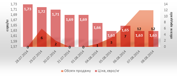 Рівень цін на поставки свиней 04-08–08.2014 відчутно знизився відносно кінця липня: з першого по п’яте серпня ціни скорочувалися на 3 євроценти щоденно і станом на 05.08 склали 1,63 євро/кг. В середині тижня відбулося невелике підвищення до 1,65 євро/кг, після чого у четвер та п’ятницю ціни повернулися до рівня цін станом на вівторок. Відбулося пожвавлення і в обсягах продажів, які за останній тиждень зросли в чотири рази відносно останнього тижня липня.