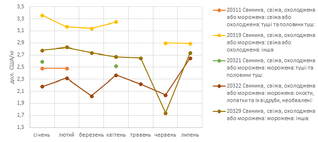 Морожені туші та напівтуші ввозилися у січні за ціною 2,59 дол. США/кг, у квітні ціна їх зменшилась до 2,52 доларів за кілограм. Найвищі ціни склалися на іншу свіжу чи охолоджену свинину, однак ціна мала негативну динаміку впродовж першого півріччя. Якщо у січні кілограм коштував 3,36 дол. США, то вже у лютому продукція цієї підгрупи ввозилася за ціною у 2,89 доларів за кілограм.