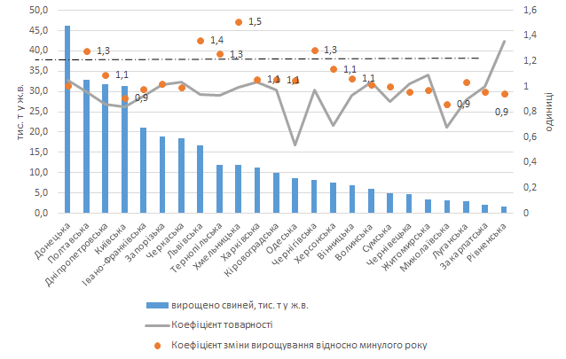 94% вирощеного в Україні поголів’я було реалізовано на забій. У Рівненській області забій на 35% перевищує вирощування поголів’я, що свідчить про вирізання свиней: станом на 1-ше липня чисельність свинопоголів’я у господарствах скоротилась на 41% (порівняно з попереднім роком). У більшості ж областей України,співвідношення «забій — вирощене поголів’я» гармонічне.