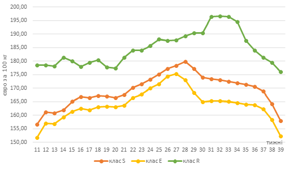 За останній тиждень вересня ціна на свиней класів S та E знизилася на 4%. Відтак, станом на 22-ге вересня центнер забійної ваги продавали по 158,04 та 152,29 євро відповідно. Свині класу R дешевшають трохи повільніше, проте, за минулий місяць ціни на них знизились на 8 євро/центнер (-4%).
