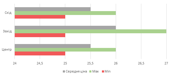 Нижчий діапазон у східних областях слугує орієнтиром для переробних підприємств, що впливає на цінову ситуацію в інших регіонах. Тож уже на цьому тижні ринок живця в Центрі та на Сході синхронізується: свиней першої категорії продаватимуть по 25-26 грн/кг. На Західній Україні ― трохи дорожче ― в середньому кілограм живої ваги коштуватиме 26 грн.