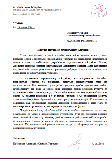 Дізнавшись про неправомірні дії підкуплених урядовців стосовно агрохолдингу «Агрейн», представники Асоціації свинарів України (АСУ) висловили свою підтримку компанії.