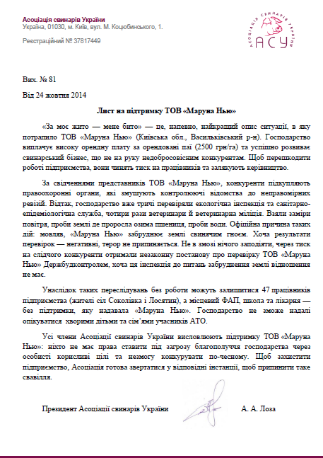 Асоціація свинарів України висловила свою підтримку ТОВ «Маруна Нью»