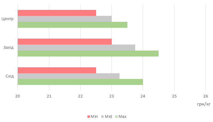 У Центральній Україні виробники були змушені збавляти ціни найактивніше. Відтак, у цьому регіоні мінімум сягнув позначки 22 грн/кг. На Заході верхній поріг зменшився на 30 копійок. Втриматися «в сідлі» змогли лише виробники у східних областях.