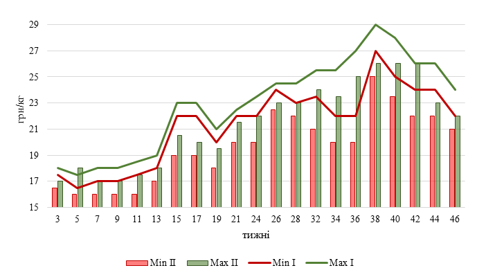 У другій декаді листопада ціна на живець свиней м’ясного типу варіюється від 22 до 24 грн/кг, тож з кінця жовтня діапазон знизився на дві гривні. Трохи менше − на гривню − змістилися межі коливання цін другої категорії: таких свиней закупають по 21-22 гривні за кілограм живою вагою, дорожче − лише у західних областях.