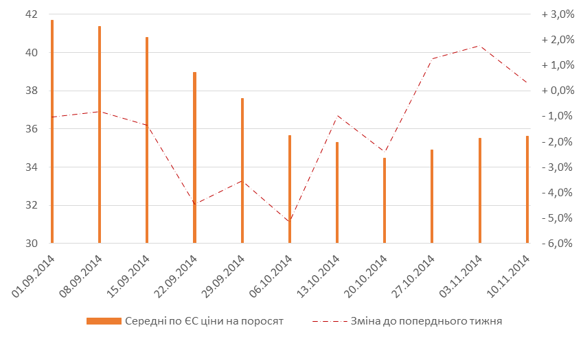 На 46-му тижні ціна одного поросяти закріпилася на рівні 35,62 євро. Це на 11 центів перевищує показник початку листопада і на 1,16 євро більше за ціни 43-го тижня. Втім, у порівнянні з відповідною датою минулого року ціна впала на 22%.