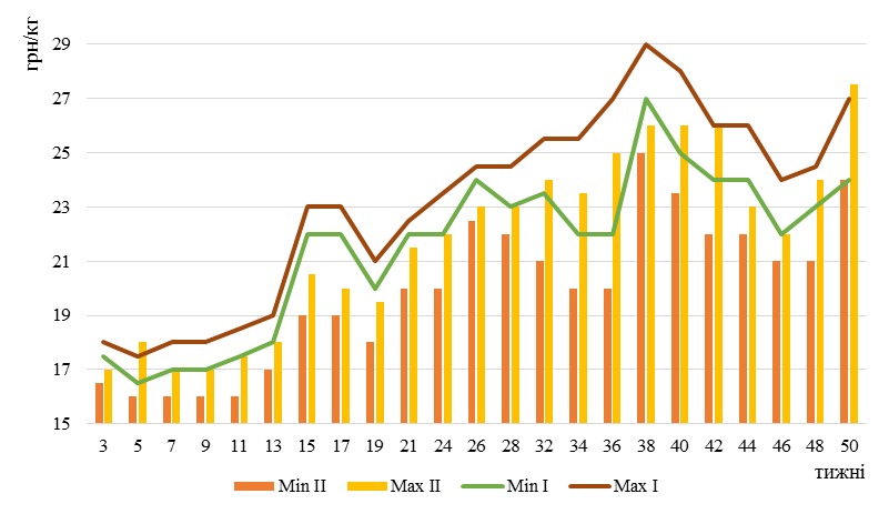 Цінові діапазони на свиней першої та другої категорії на п’ятдесятому тижні майже зрівнялися. М’ясних свиней закупають в середньому по 26 гривень за кілограм і дорожче, то подекуди лунають і суттєво нижчі ціни ― 24-24,5 грн/кг. Закупівельна ціна на другу категорію свиней варіюється від 24 до 27,5 гривень за кілограм.