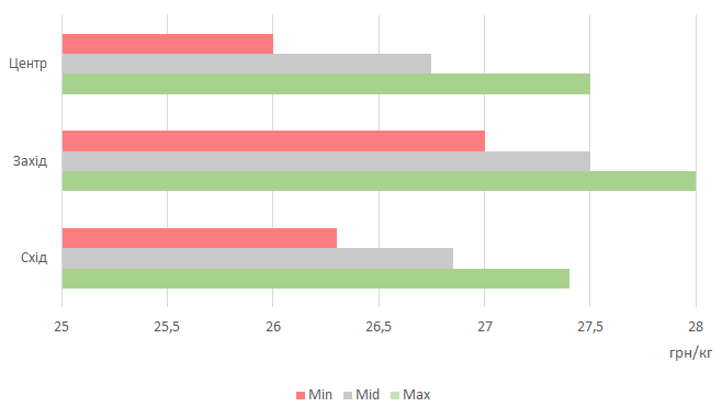 Однак на цьому тижні зростання цін на свиней забійних кондицій матиме більш епізодичний характер. Переробники налаштовані залишити ціни на рівні минулого тижня у зв’язку з нижчою споживчою активністю населення. Отже, діапазон закупівельних цін у центральних та західних областях розшириться до 1 грн та 1,5 грн відповідно, на Сході, навпаки, звузиться незначно (на 0,2 грн), але середні ціни залишаться на позначці 27 грн/кг.