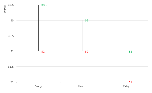 Так, на Сході свинину першої категорії живою вагою планують реалізувати по 31-32 грн/кг, а діапазон у центральних та західних областях майже синхронізувався. Західний регіон вже традиційно лідирує за максимальною ціною, яка становить 33,5 грн/кг.