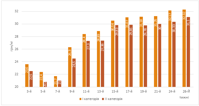 Динаміка закупівельних цін на свиней потижнево, грн/кг