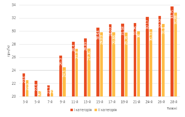 Після крокоподібного зростання цін на ринку живця у червні, липень почався із «злету» закупівельних цін на свиней. Так, за два тижні середня ціна на м’ясну свинину живою вагою піднялася до 33,75 грн/кг, тоді ціна живця другої категорії впритул наблизилась до позначки 33 грн/кг і становить 32,87 грн. Так зміна котирувань на внутрішньому ринку (майже на 1,5 та 2 гривні на кілограм, відповідно до зазначених категорій) була спровокована активною зовнішньою торгівлею.