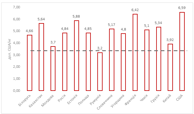 Так, нижчими за середній по Україні рівень цін на свинину може «похвастатись» лише Румунія, де кілограм цього виду м’яса упродовж квітня-червня можна було придбати по 3,2 дол. США. Найбільш наближеними до українського рівня були споживчі ціни на свинину в Молдові (3,7 дол. США/кг) та Китаї (3,92 дол. США/кг). Тоді, як у США та Франції споживачі платять за кілограм свинини майже вдвічі більше ніж в Україні.