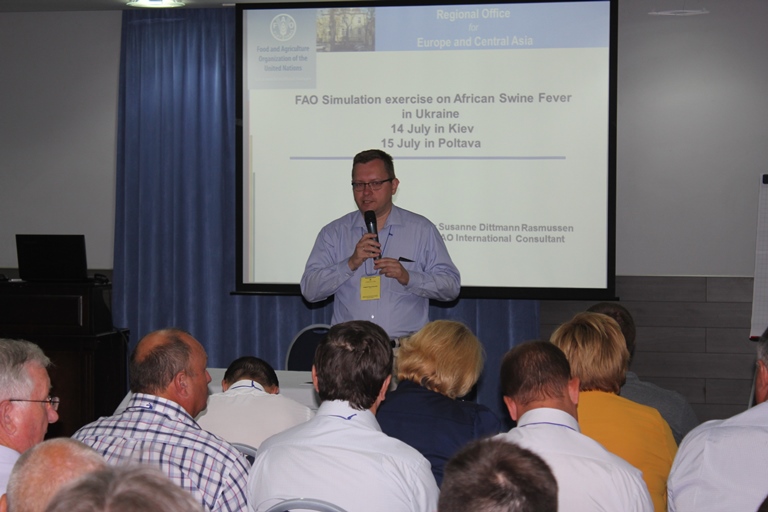 Стартував проект із двох семінарів-симуляцій, які відбулися у Києві та Полтаві. Вони пройшли під кураторством спеціально запрошеного міжнародного експерта ФАО С’юзен Расмуссен. Головна мета цих заходів — розвинути потенціал з управління спалахом африкансmкої чуми свиней в Українi на різних рівнях. «Фактично, ваше завдання — діяти так, ніби стався реальний спалах. Потрібно дотримуватися інструкцій, плану дій», — звернулася пані Расмуссен до учасників.
