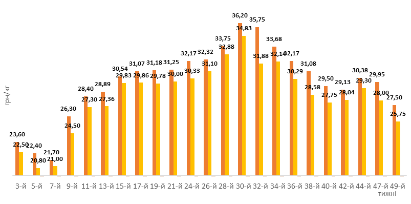 Проте, очікування стосовно відновлення курсу на зростання не справдилися. В результаті вже на початку грудня ціна сягнула нових мінімальних позначок: живець І-ї категорії закупляли у середньому по 27,5 грн/кг, тоді як ціна «двійки» подекуди опустилася нижче позначки у 26 грн/кг.