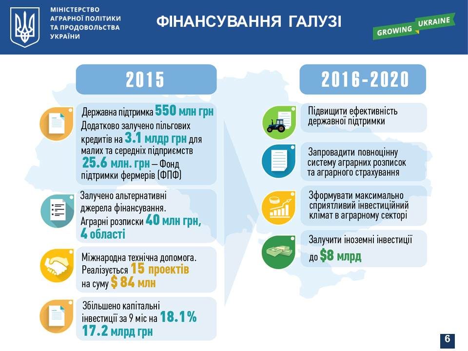 Міністр нагадав, що за 9 місяців 2015 року обсяги капітальних інвестицій у сільське, лісове та рибне господарство зросли на 18,1% порівняно з відповідним періодом минулого року і склали майже 17,2 млрд грн. Загалом, у цьому році в аграрну галузь залучено інвестицій близько 1 млрд доларів США. До 2020 року планується збільшити цю суму до 8 млрд дол. США.