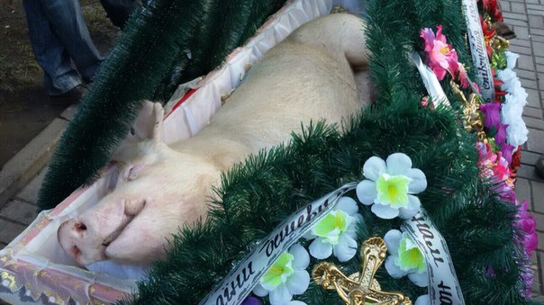 11.40 — відбулася акція символічного поховання українського тваринництва. Біля ВРУ люди зібрались перед труною з метрвою свинею та вінками. З труною спробували пройти до ВР, але міліція не пропустила.