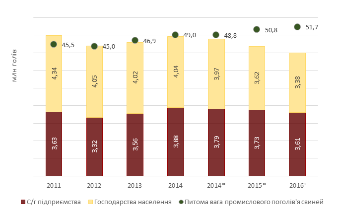 За рік поголів`я свиней в Україні скоротилося на 358 тис. голів через суттєве (-6,6%) зменшення чисельності цих тварин у господарствах населення. Так, на початку минулого року у «присадибників» налічувалось 3,62 млн свиней, а 2016-й починається з історично найнижчого показника — 3,38 млн голів.