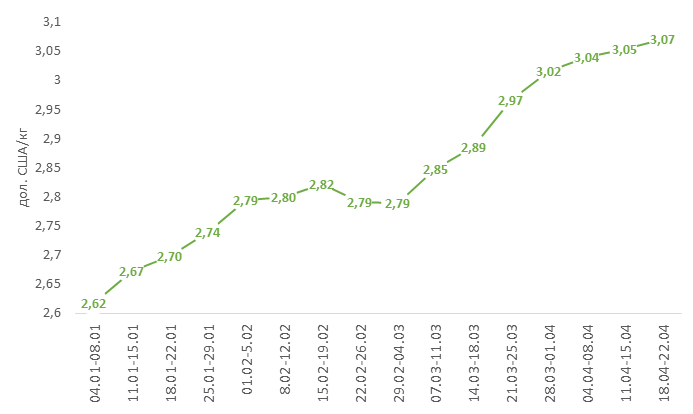 Ціни на ринку живця свиней у Піднебесній продовжують зростати. Станом на 16-й тиждень кілограм свинини живою вагою в Китаї коштував 3,07 дол. США/кг (за інформацією порталу Pig333.com).
