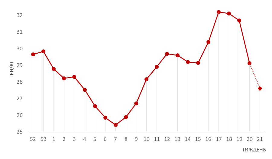 Ціна на ринку живця попереднього тижня не втрималася на плановому рівні, тож середня її позначка у кінці другої декади місяця становила 29,1 грн/кг. Це на 8% нижче ніж тижнем раніше. Результати п’ятничних торгів свідчать, що на цьому низхідний рух не завершився.