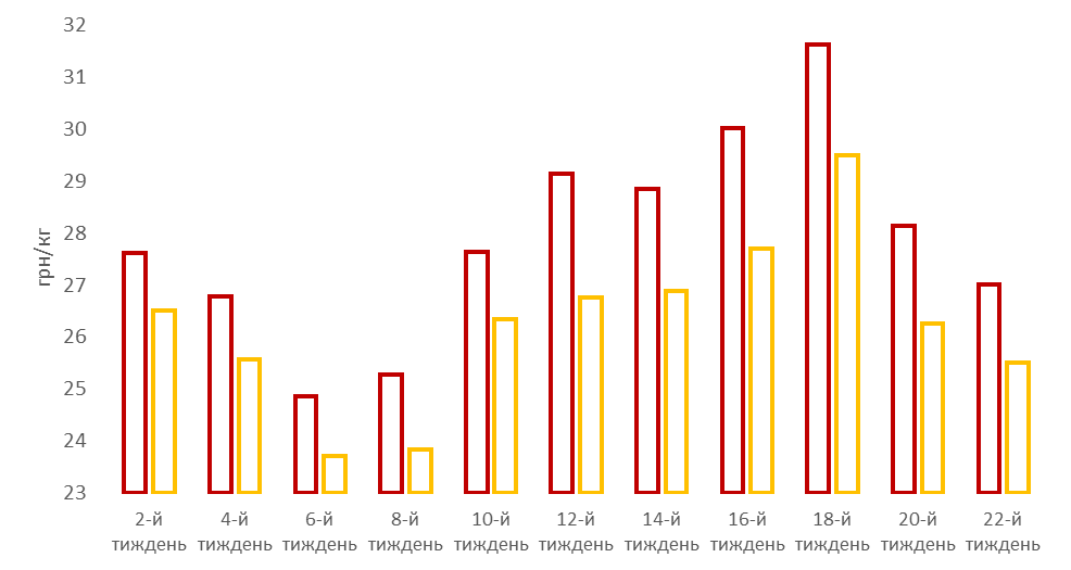 За результатами моніторингу АСУ, середня ціна на живець свиней першої категорії на початку 22-го тижня складає 27 грн/кг. Проте, як на Заході країни, так і в східних областях звучать і дешевші пропозиції. Ситуація з «двійкою» не краща: хоча закупівля переважно ведеться в діапазоні 25-26,5 грн/кг, невеликі за обсягами партії можна закупити на 1-2 грн/кг дешевше.