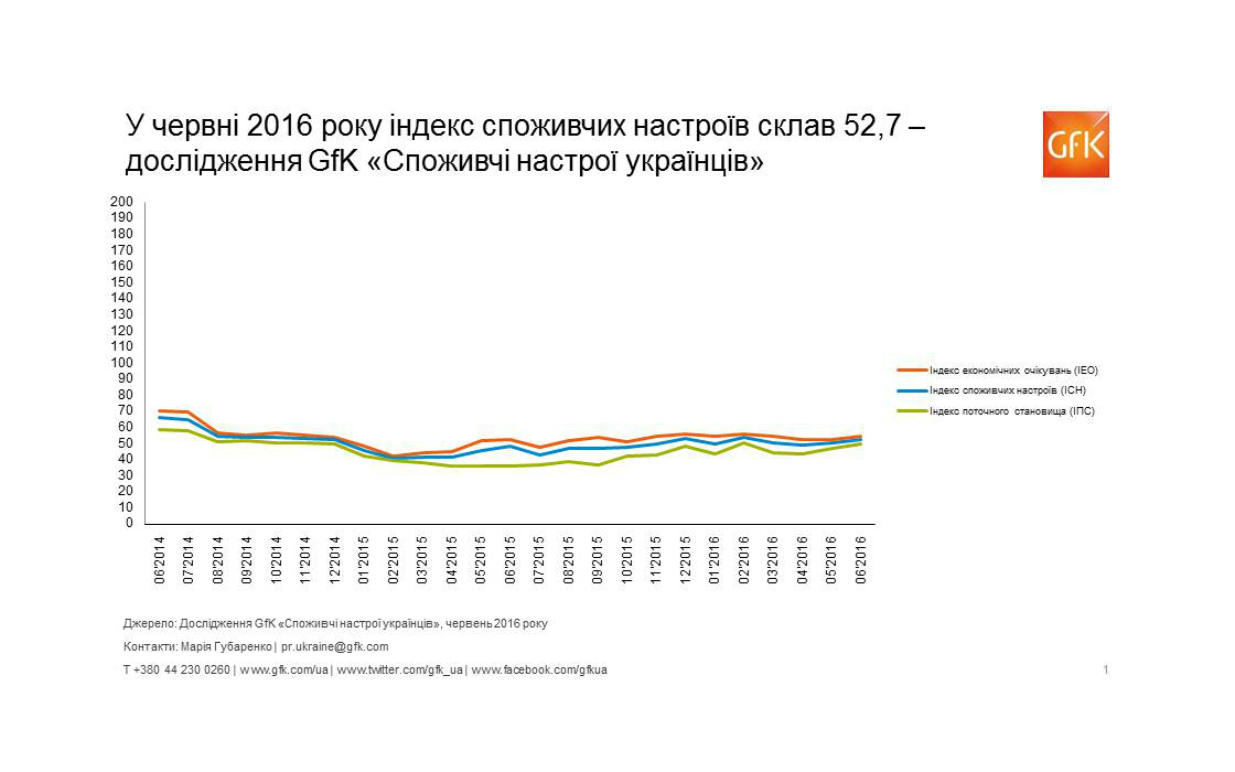 У червні 2016 року споживчі настрої українців покращилися: індекс споживчих настроїв (ІСН) становив 52,7, що на 2,4 пункти більше за травневий показник. Найбільших змін зазнав індекс поточного особистого матеріального становища.