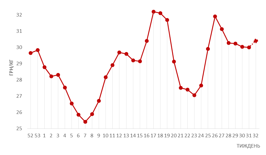 Не зважаючи на загальний «штиль» на ринку деяким свинарям вдалося отримати на 0,15-0,4 грн/кг вищу ціну ніж попереднього тижня. Зокрема, відзначається підвищення котирувань на Заході країни. Там спостерігається зменшення пропозиції свиней забійних кондицій із сезонних причин. З огляду на таку тенденцію, представники м’ясопереробки не виключають, що Центр та Схід можуть «підхопити» цю хвилю наступного тижня. Проте більшість переробників налаштована на відносну стабільність цін до початку осені.