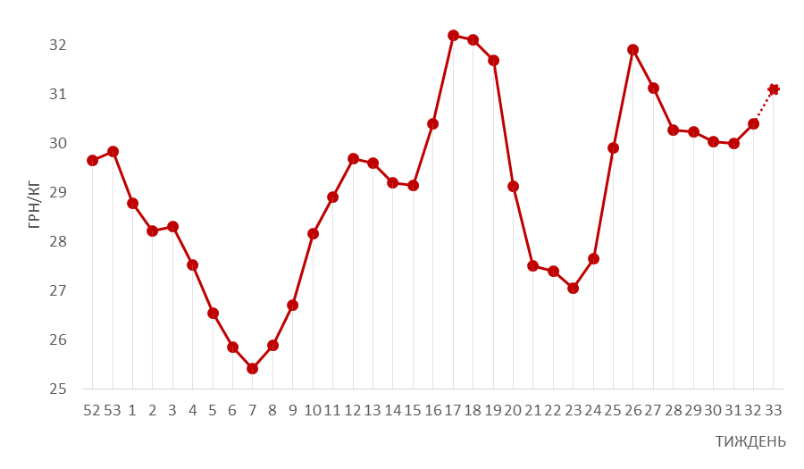 За результатами п’ятничних торгів виробники свинини змогли «розписати» товарне поголів’я за ціною на 0,5-1 грн/кг вищою ніж тижнем раніше. В результаті цього верхня межа діапазону закупівельних цін сягнула 32 грн/кг, а реалізація живця по 31,5-31,75 зустрічається все частіше. Основною причиною такого зростання є нижча пропозиція, спричинена повільнішим приростом ваги свиней через спекотну погоду. При цьому виробники відзначили досить жвавий попит з боку заготівельників.