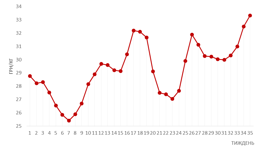 Літня пора завершилася для виробників свинини на позитивній ноті: вдалося втримати ціни на очікуваному рівні. За результатами 35-го тижня середня ціна реалізації свиней забійних кондицій І-ї категорії склала 33,3 грн/кг. Це майже на 1 грн/кг дорожче середньої закупівельної ціни на ринку живця підчас передвеликоднього піку.