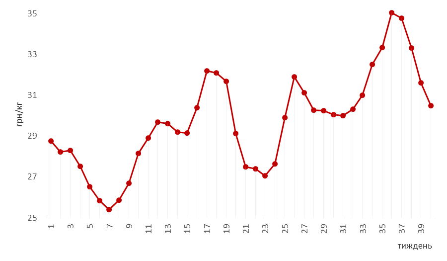 Перша декада жовтня не радує виробників свинини: ціна на тварин забійних кондицій продовжує досить стрімкий рух у бік пониження. Зокрема, у кінці вересня ціна на живець свиней І категорії в основному варіювала в межах 31-32 грн/кг, то в перші дні другого місяця осені «робочий» діапазон цін понизився до 29-31 грн/кг.