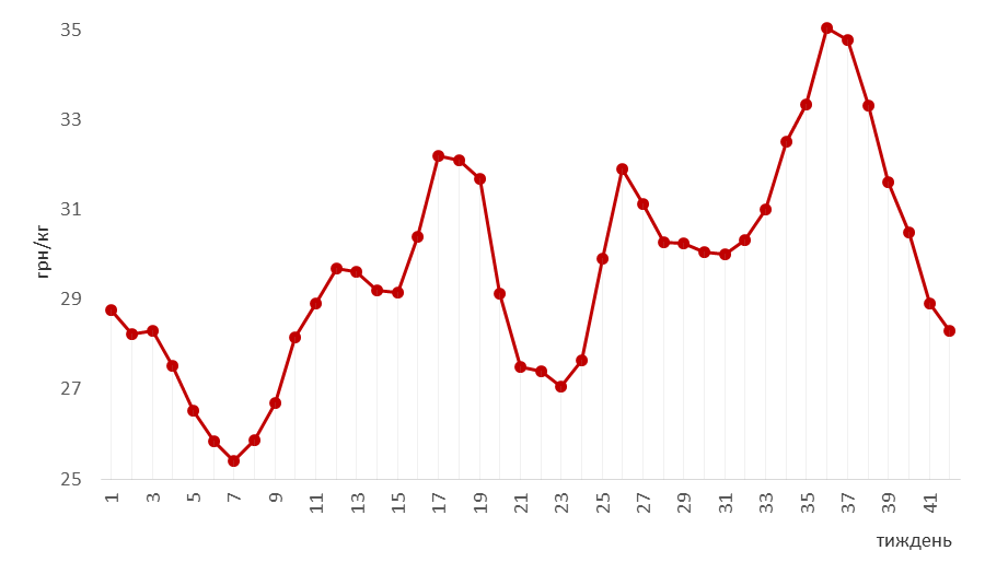 «Чим далі, тим нижче» — так можна охарактеризувати рух цін на живець свиней в Україні. Так, якщо на початку жовтня ціна коливалася в районі 30 грн/кг, то у другій його половині середня цінова позначка трохи вища 28 грн/кг і тяжіє до зниження. Зокрема, протягом 41-го тижня середня ціна на свиней І-ї категорії складала 28,9 грн/кг, товарне поголів’я на 42-й тиждень вже «розписали» в середньому по 28,3 грн/кг. Проте вже під кінець тижня закупівельники озвучували «робочий діапазон» цін в межах 27-28,5 грн за кілограм «м’ясної» свинини живою вагою, тоді як тварин забійних кондицій другої категорії закуповували по 26 грн/кг.