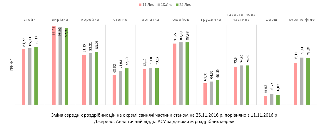 Роздрібні ціни на свинячі частини у другій половині листопада змінилися незначно. Так, свинячий стейк подорожчав менше ніж на 1,5 грн/кг з кінця другого тижня місяця. Корейка та грудинка піднялися в ціні на 2 грн/кг, стегно свиняче минулої п’ятниці коштувало в середньому на 4 грн/кг дорожче — 83,2 грн/кг. Здороження свинячих лопаток, ошийку та тазостегнової частини не перевищило і 1 грн/кг. Водночас середня роздрібна ціна курячого філе у середині місяця зросла на 3,3 грн/кг — до 79,4 грн/кг. Це на 18% чи більш ніж на 12 грн/кг дорожче ніж рік тому. Зазначимо, що роздрібна ціна свинячого стейку в аналогічний період минулого року була трохи (+0,9%) вищою, фарш коштує на 12,5% дешевше, а свиняча вирізка, яка протягом другої половини листопада 2016-го знижувалась в ціні, коштує лише на 0,7% дорожче.
