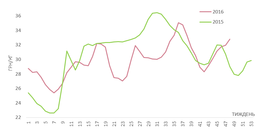 Після відносно сталих цін на свинину живою вагою протягом попереднього тижня, котирування знову рушили в гору. Так, якщо на 48-му тижні середня ціна закупівлі живця трохи «не дотягувала» до позначки у 32 грн/кг, то в останні дні листопада вона, найвірогідніше, перевалить за позначку 32,5 грн/кг. Це — більше ніж на 3,5 грн/кг чи на 12% дорожче ніж рік тому. Тож другий тиждень підряд котирування на ринку живця перевищують значення аналогічного періоду минулого року, а їх рух не відповідає динаміці кінця листопада 2015-го.