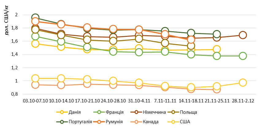 Відчутно нижчі ціни ніж місяцем раніше, спостерігалися в РФ упродовж першої половини листопада. Зокрема, протягом перших тижнів листопада середня ціна опустилася нижче 1,5 дол. США проти 1,74 дол. США у середньому протягом жовтня. Проте третя декада місяця ознаменувалася «стрибком» ціни до 1,79 дол. США. Хоча АЧС в країні шириться і надалі, в тому числі на промислових свинарських об’єктах, безпосереднього впливу на закупівельну ціну це поки не має.