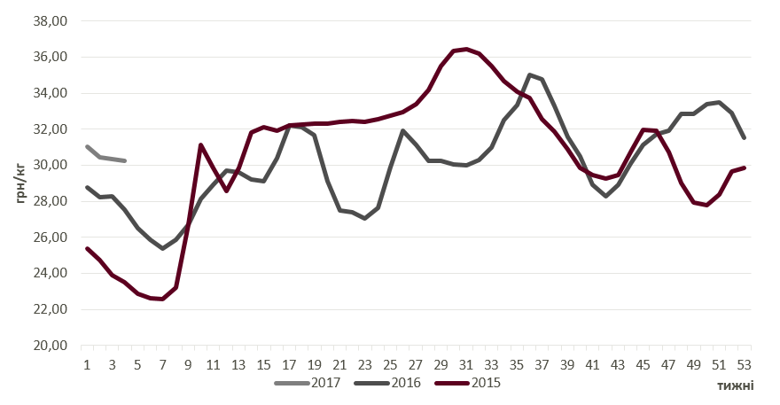 Динаміка закупівельних цін на живець свиней І-ї категорії (2015-2017 рр.)