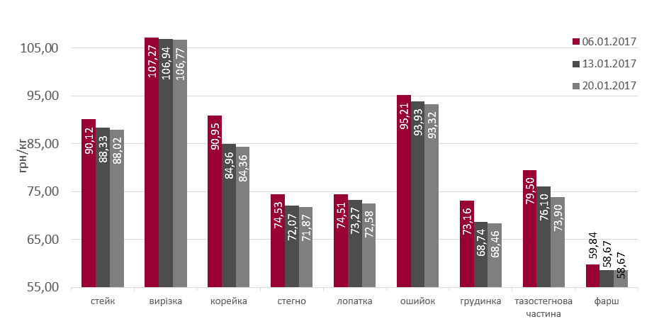 В наслідок незначного коливання цін на сировину зміна роздрібних цін свинячих відрубів була незначною та обмежилася кроком до 1 грн/кг у бік пониження. Винятком стала лише ціна тазостегнової частини, що подешевшала на 2,2 грн/кг. Цю товарну позицію на початку третьої декади січня можна було придбати по 73,9 грн/кг.