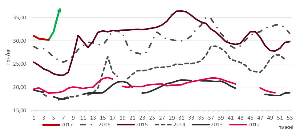 Динаміка закупівельних цін на живець свиней І-ї категорії (2012-2017 рр.)
